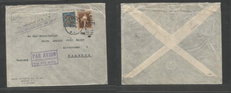 Philippines. 1936 (6 July) Manila - Germany, Hamburg. Air multifkd envelope "via Singapore KLM" Royal Netherlands Airlines" (xxx/R) Fine air usage. (Image)