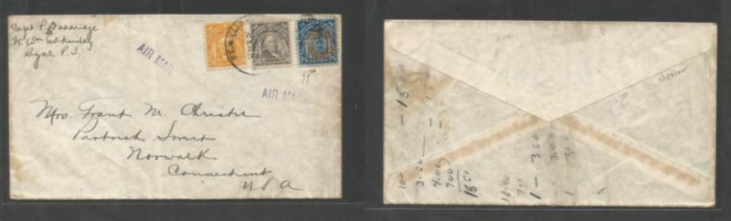 Philippines. 1936 (Aug 14) Fort Wm. McKinley . USA, CT, Norwalk. Air multifkd at 4,50 pesos rate, red ovptd issues 4p tied cds. High rate. (Image)