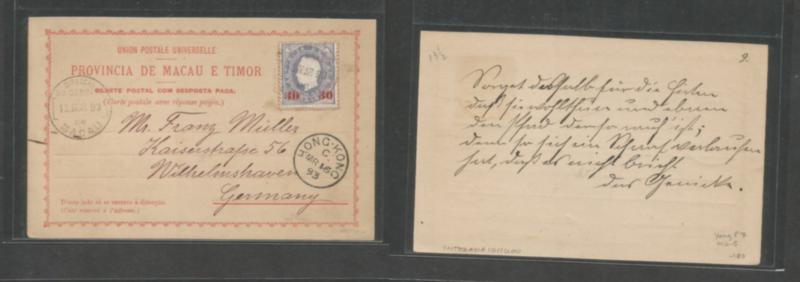 Macau. 1893 (15 March) GPO - Germany, Wilhelmshaven via Hong Kong. 30a red ovptd D. Luis issue fkd bilhete postal. Yang P-7, HG-5. VF + scarce in perfect condition. (Image)