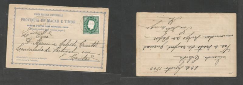 Macau. 1893 (23 Aug) GPO - China, Canton, Portuguese Consul. 10rs green 60 Luis fkd Bilhate postal, tied cds, also alongside. Fine + scarce usage. HG4, 4-P4, OM-IA "provincia" + 5 mns size. (Image)