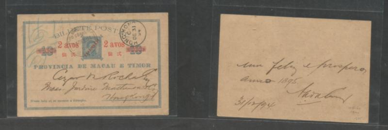 Macau. 1894 (31 Dec) GPO - Hong Kong (31 Dec) Zavo red bilingual early 10a blue stationery card. VF and extr rare perfect condition for circulated item HG-60. 98mm. (Image)