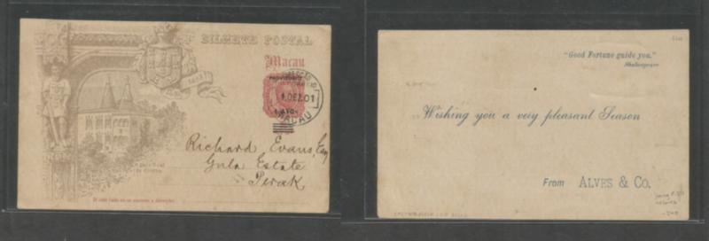 Macau. 1901 (1 Dec) GPO - Perak, Gula Estate. Provisorio ovptd 1 avo / 2av. Illustrated red stat card, tied cds. Very rare destination interasian usage, the first we see. (Image)