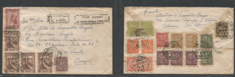 Macau. 1947 (16 Apr) GPO - Brazil, S. Paulo. Via airmail - Hong Kong. Registered massive multifkd front and reverse, mixed issues, box "par air de Hong Kong a London" R cachet reverse transited espectacular circulation. (Image)