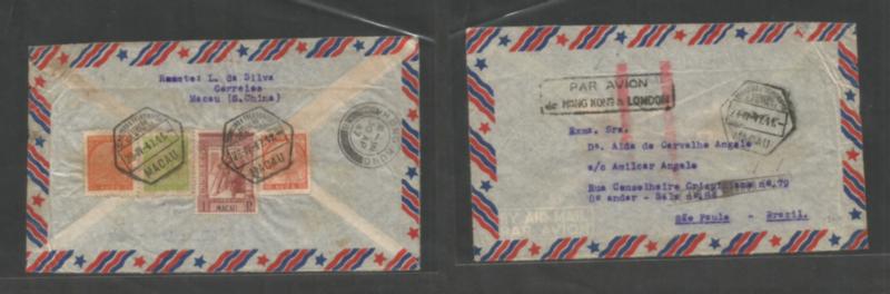 Macau. 1947 (28 Apr) GPO - Brazil, S. Paulo. Reverse air multifkd envelope, doble air cachets "Para avion de Hong Kong a London" + "By air to London only" Mixed issues, 1,60p rate. VF condition. (Image)