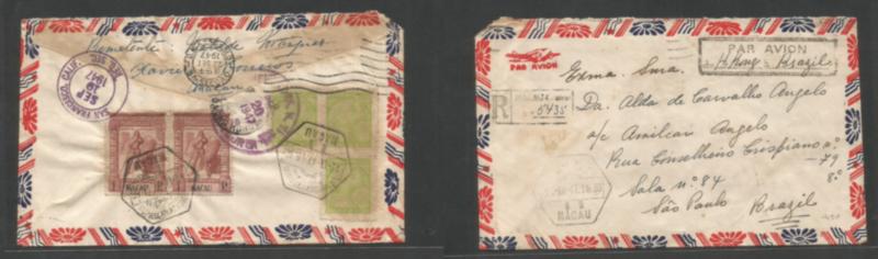 Macau. 1947 (12 Sept) GPO - Brazil, St. Paulo (22 Sept) via New York (20 Sept) - S. Francisco (19 Sept) Registered multifkd envelope, at 2,90 patacas rate, tied hexag ds. VF usage. (Image)