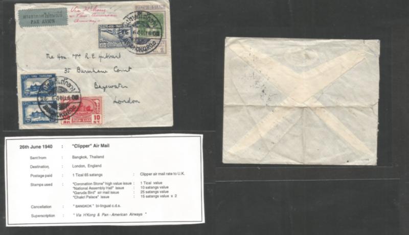 Siam. 1940 (26 June) BKK GPO - London, Bayswater, UK. Air multifkd envelope via Hong Kong Pacific Clipper Panamerican, endorsed. Fine. (Image)