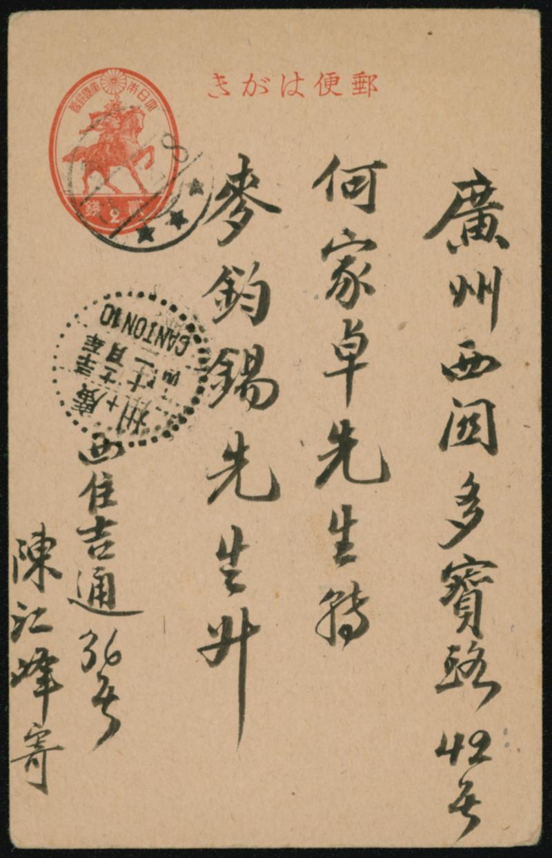 Internal Postalcard 1937 issue 2 Sen comb cds 1942-12-08 Hong Kong to CANTON arrival :12/11 surface postal card to China (Image1)