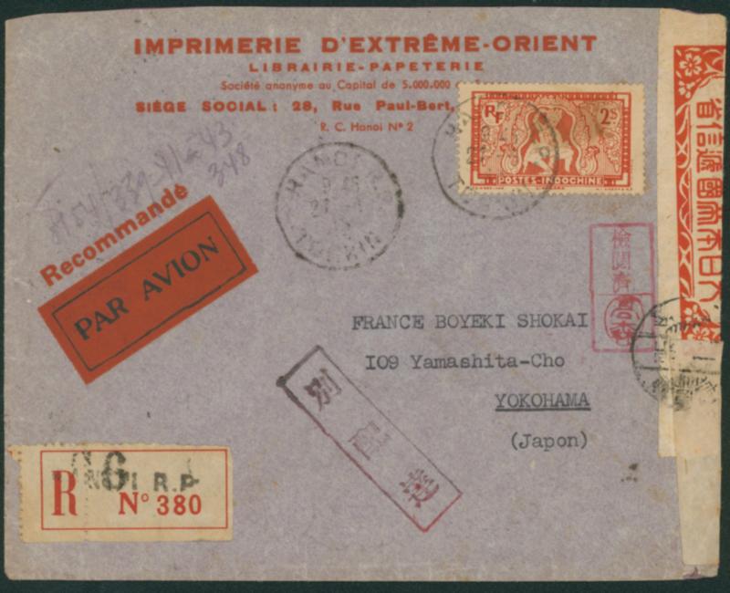Indochina 2 pi red single franking cancelled by datestamp 1942-06-27 HANOI to Yokohama arrival :7/11 registered express letter, censored (Image1)