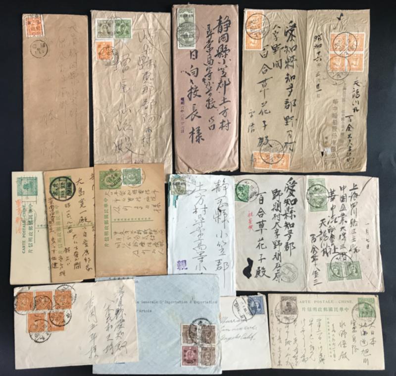 , 9 covers, 4post(al) cards 1930-1946 Twelve examples of usage for Japan. Includes various usage examples such as unoverprinted, Provincial Issues, and Japanese Occupation area. Includes one example of use after the Second Sino-Japanese War. (Image1)