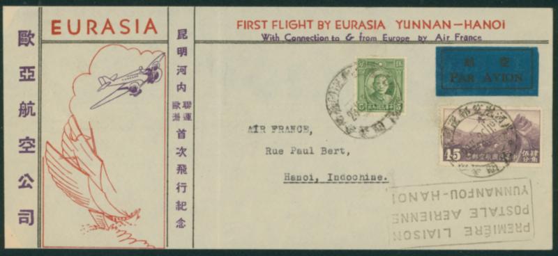 China 1937 Second London print SYS 5c., and Third Peking Print Air Mail 45c. cancelled by special cds in black 1937-12-23 Kunming arrival :Hanoi 1937-12-23 FFC between Kunming and Hanoi by Eurasia Aviation Corporation's. Airmail fee to Hanoi: 50c. (Image1)