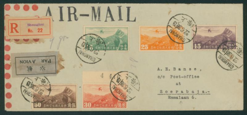 China 1936 The cover features five different Third Peking Print Air Mail Issues. cancelled by datestamp in black 1936-06-22 Shanghai to Soerabaja arrival :1936-07-08 (Image1)