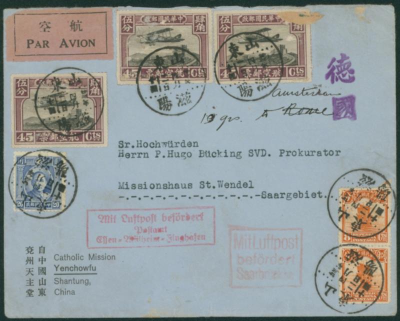 China 1934 Second Peking print Junk 8c. pair, First London Print SYS 20c., and Second Peking Print Air Mail 45c.(3) cancelled by datestamp in black 1934-04-02 Tenchowfu to Germany transit :Shanghai 1934-04-03 arrival :Essen 19314-04-27 Domestic flights, KLM overseas to Italy. Airmail for flight route to Italy (winter, 15g):$1.70(1c. overpaid) (Image1)