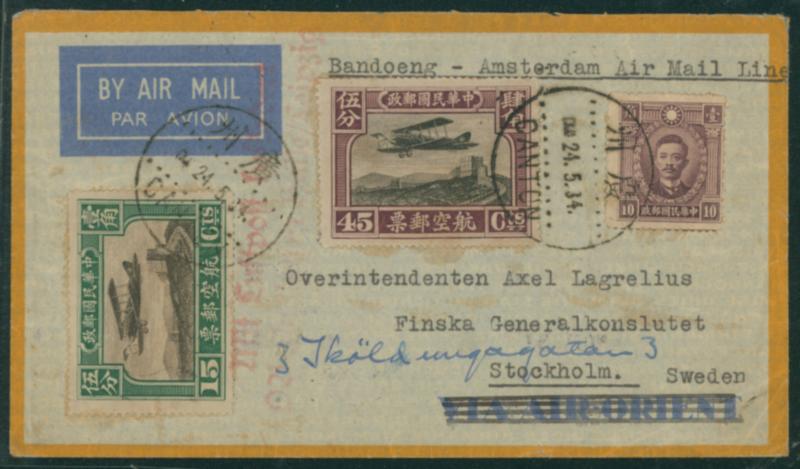 China 1934 Peking Martyrs 10c., Second Peking Print Air Mail 15c., 45c. cancelled by datestamp in black 1934-05-24 Kwangchow to Sweden arrival :Stockholm 1934-06-07 KLM Bandung-Amsterdam Air Route Flight Letter. Foreign letter fee via air route to the Netherlands (10g): 70c. (Image1)