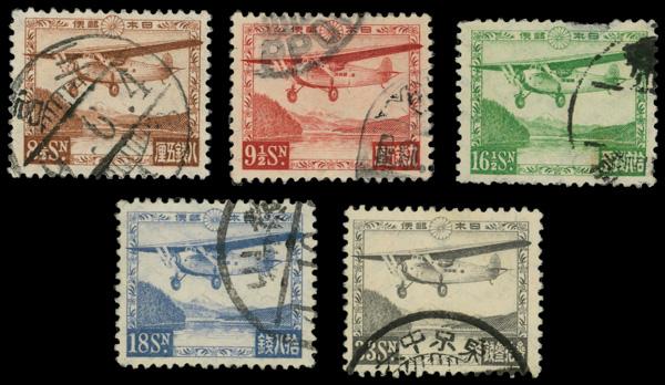 1929-34, Ashinoko Airmail, 8½s-33s complete (Scott C3-C7); #C5 thins, Very Fine. J.S.C.A. A1-5. Scott $95. (Image)