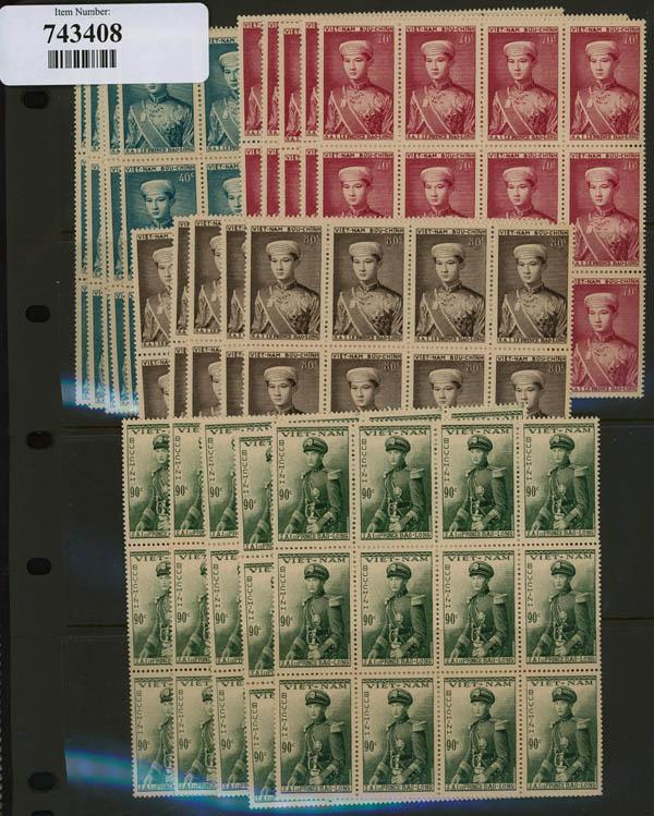 1954, 40c-100pi Bao Long (Scott 20-26), 100 complete sets of singles, in folded blocks of 20 or 10; brown gum as normal, o.g., never hinged, Post Office fresh, Very Fine. Scott $2,250. (Image)