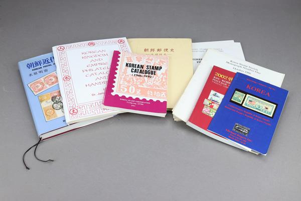 Reference Collection for Korea, several valuable publications for the Korean specialist; includes case bound exhibit entitled Postal History of Korea - Lee Dynasty Era 1884-1905, Korean Stamp Catalogue (1946-1992), several Korea Stamp Society Monographs on postal stationary and Korean-English philatelic glossary, 2002 KPC Postage Stamp Catalogue, Korean Kingdom and Empire Philatelic Handbook and Catalog, and lastly a hardbound book in Korean entitled Korean Postal History 1884-1905; compact and useful lot for the right bidder, Fine to Very Fine. (Image)