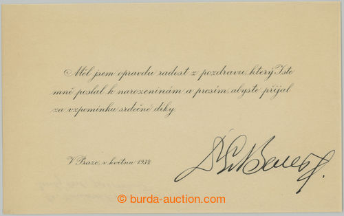 Autographs. BENES Edward (1884-1948), other Czechosl. president and foreign minister, autograph on thanks for congratulation to birthday (on/for pergamenu); very fine and sought (Image)
