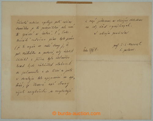 Autographs. MASARYK Thomas Garrigue (1850-1937), the first Czechoslovak President; handwritten 3-strankovy (!) letter sent to Joseph Tersche (1853-1930, president country finance headquarters in Prague), incl. original envelope/-s; hints of adjustaci and toned, overall but good condition, supplemented with about/by grafiku with portrait T. G. Masaryk, rukopisy Masaryk are very sought and for collectors favourite, from period before y. 1918, in addition like that long, with objevuji exceptionally! (Image)