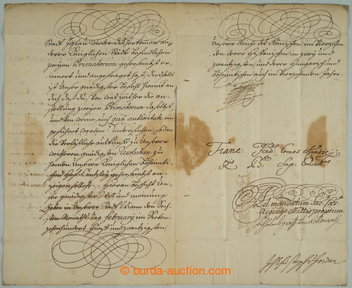 Autographs. VeZNIK Z VeZNIK Francis Xaver (1711-1789), Czech nobleman, politician and state urednik, zastaval the highest offices in authority Bohemian kingdom and patril to/at strujcum terezianskych and josefinskych reforem, autograph on document, folded sheet paper with filigranem; uvolneny kryt with 5 seals, overall well preserved, rare signature (Image)