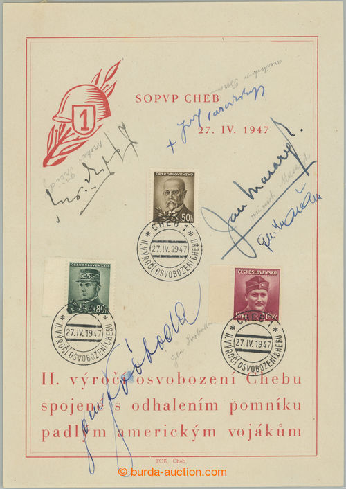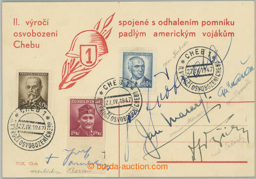 Autographs. memorial PC to 2. anniv of liberation Cheb with manual signatures personalities, i.a. John MASARYK (1886-1948, Czechoslovak politician, foreign minister), Lewis SVOBODA (1895-1979, General and Czechoslovak president), Joseph cardinal BERAN (1888-1969, archbishop Prague and primas Czech), national prokurator Francis TRZICKY and oths.; nice good condition (Image)