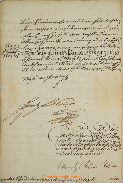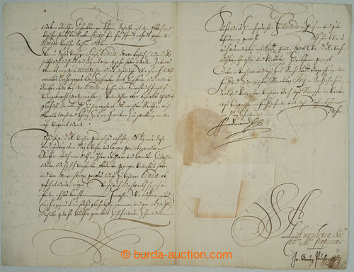 Autographs. FERDINAND III. (1608-1657), Holy Roman Emperor, King of Bohemia and Hungaria, autograph on TESTER folded letter (missivu) in German addressed on/for Francis from Hatzfeldu, biskupa bamberskeho and wurzburskeho, then attached i.a. signature nejvyssiho hofmistra Joh. Georga Puchera von Meggenhausen, folded sheet paper with filigranem, preserved imperial seal with papirovym krytem; sporadically signs of age, overall good in good condition condition, rare occurrence, extraordinary offer! (Image)