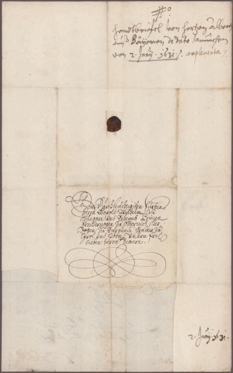 Autographen HERZOG ALBRECHT VI. von Bayern(1584-1666), Bruder des Kurfürsten Maximilian I., eigenhändiger Schnörkelbrief an Erzherzog Leopold Wilhelm, datiert vom 2.1.1631, eigenhändig geschriebener und unterzeichneter Glückwunschbrief zum Neujahrsfest. Mit kleinem roten Wappensiegel. Seltenes eigenhändiges Schriftstück, sehr dekorativ! Erhaltung: Brief (Image)