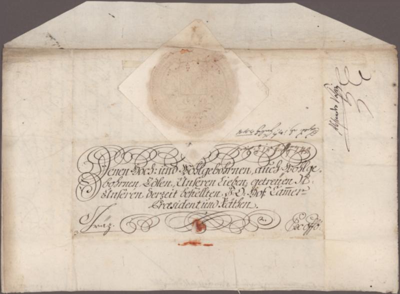 Autographen KAISERIN MARIA THERESIA (1717-1780), attraktiver und gut erhaltener 4-seitiger Schnörkelbrief aus Wien vom 1.7.1748 mit eigenhändiger Unterschrift, adressiert an den Hofkammerpräsidenten und die Räte der Stadt Graz, mit großem, papiergedeckten Prägesiegel(oben leicht gebrochen). Ein sehr schönes und dekoratives Zeitdokument. Erhaltung: Brief (Image)