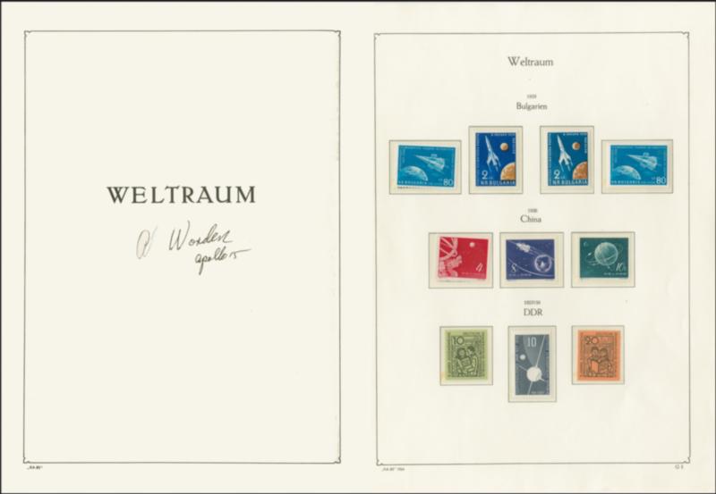 Alfred Worden (Besatzungsmitglied Apollo 15), eigenhändige Unterschrift in jedem Band einer 13-bändigen postfrischen Weltraum-Sammlung mit Marken, Blocks und Kleinbogen aus 1944-70. In dieser Form ein absolut einmaliges Objekt !