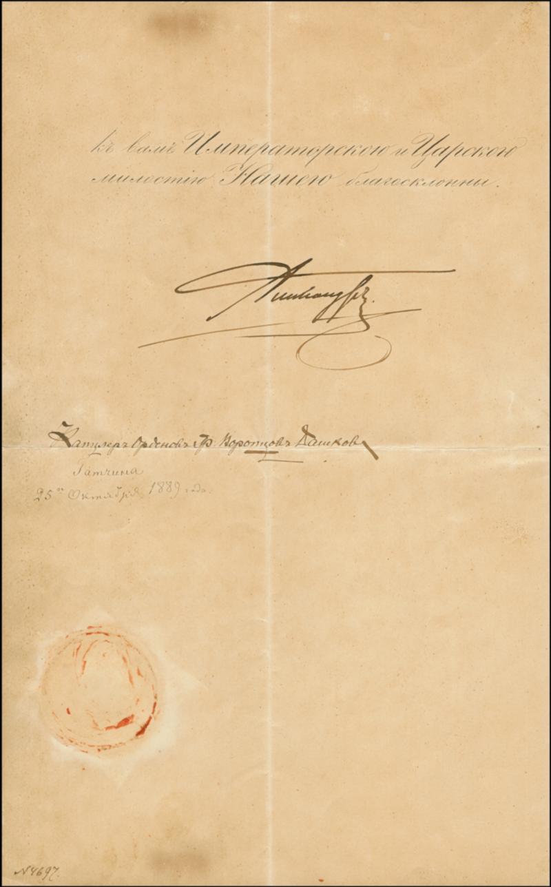 Alexander III, Kaiser von Russland (1845-1894), offizielle Urkunde datiert 1889 über die Verleihung der Ritterwürde an den österreichisch-ungarischen Konsul in St Petersburg mit eigenhändiger Unterschrift "Alexander”, mehrfach gefaltet, Papiersiegel von der Urkunde abgelöst, sonst in guter Erhaltung, selten