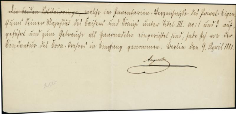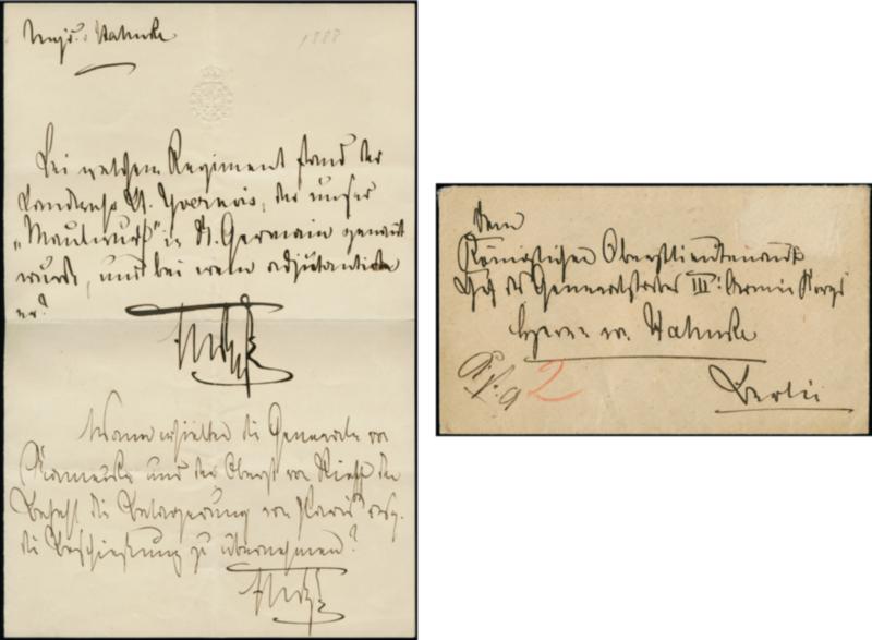 Friedrich III., König von Preußen und Deutscher Kaiser, Briefbogen mit königlichem Wappen, mit 2 kurzen eigenhändigen Texten und Unterschriften, mit zugehörigem Briefkuvert (Ankunftsstempel vom 13. Juni, 2 Tage vor dem Tod des Kaisers) an den Chef des Militärkabinetts Herrn von Hahnke in Berlin.