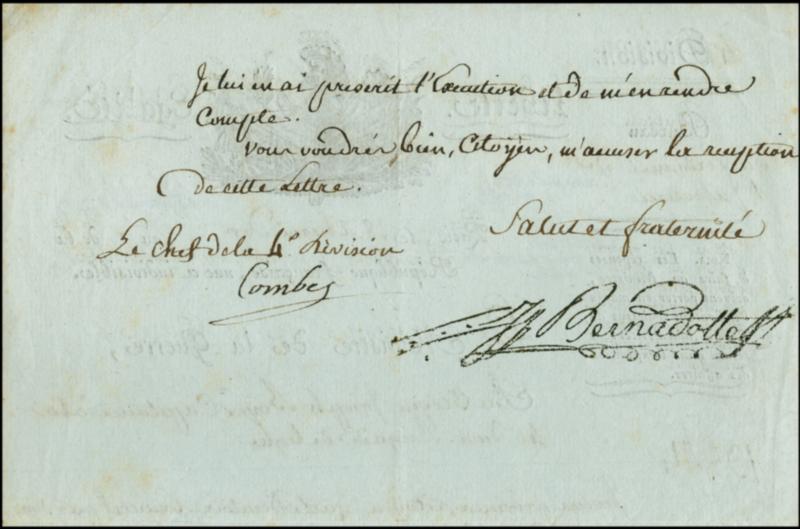 Bernadotte, Jean Baptist Jules (1764-1844), Marschall von Frankreich und später als Carl XIV. König von Schweden und Norwegen, Unterschrift auf Schreiben mit Briefkopf der 4. Division, an den Ordonateur en Chef der hannoverschen Armee wegen der Gratifikationen, die an 5 namentlich genannte Generale als Teilnehmer an der Kaiserkrönung Napoleons zu zahlen seien. Sammlernotizen in Bleistift.