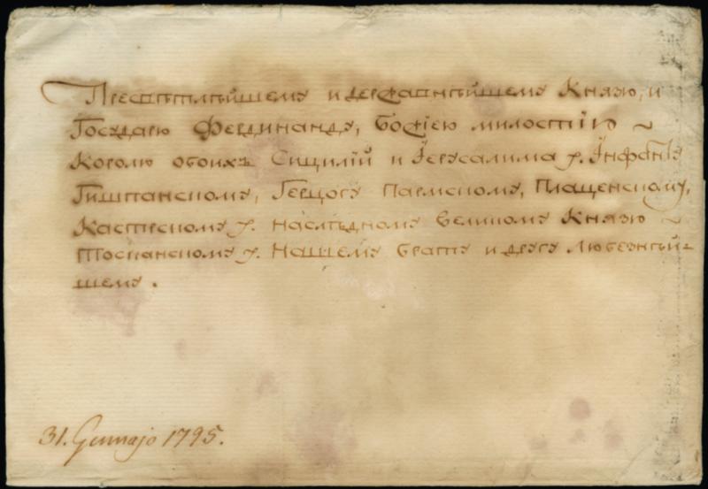 Katherina II, Kaiserin von Russland (1729-1796), großformatiger, kompletter Faltbrief, datiert "St Petersburg 31 Januar 1795”, mit eigenhändiger Unterschrift "Ekaterina”, getönt und fleckig, dennoch in guter Erhaltung, seltener Trauerbrief zum Tod ihrer Enkelin Olga Pawlowna (1792-1795)