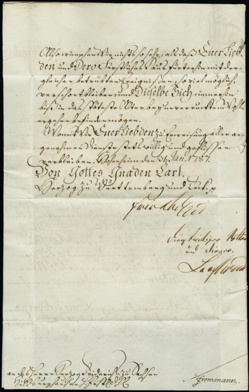 Carl Eugen, Herzog von Württemberg (1728-1793), eigenhändige Unterschrift auf Brief 1787 an den Herzog Friedrich von Sachsen-Hildburghausen, zum Tode des Regenten Joseph Friedrich