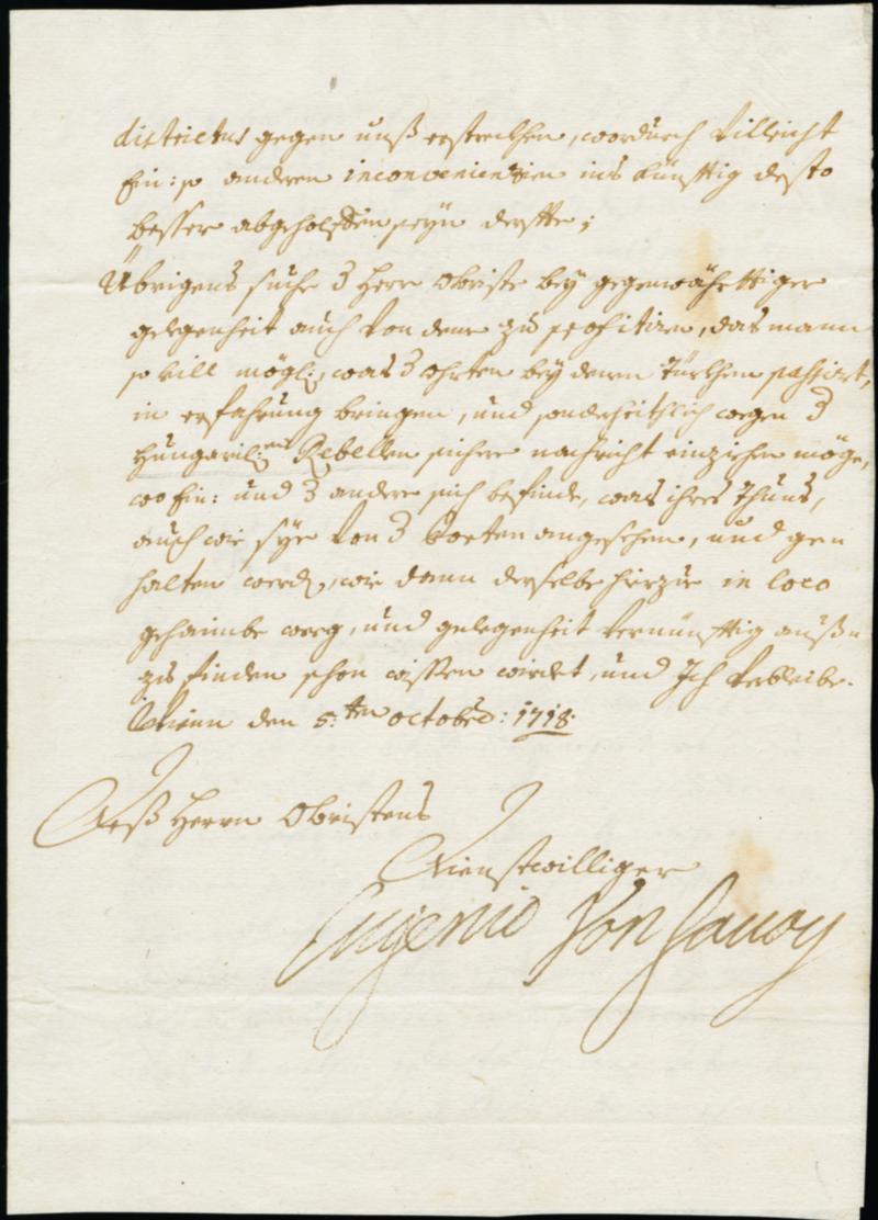 Eugen, Prinz von Savoyen (1663-1736), eigenhändige Unterschrift "Eugenio von Savoy" auf 3seitigem Schreiben aus Wien 1728. Erwähnt werden u.a. "3 hungarische Rebellen"