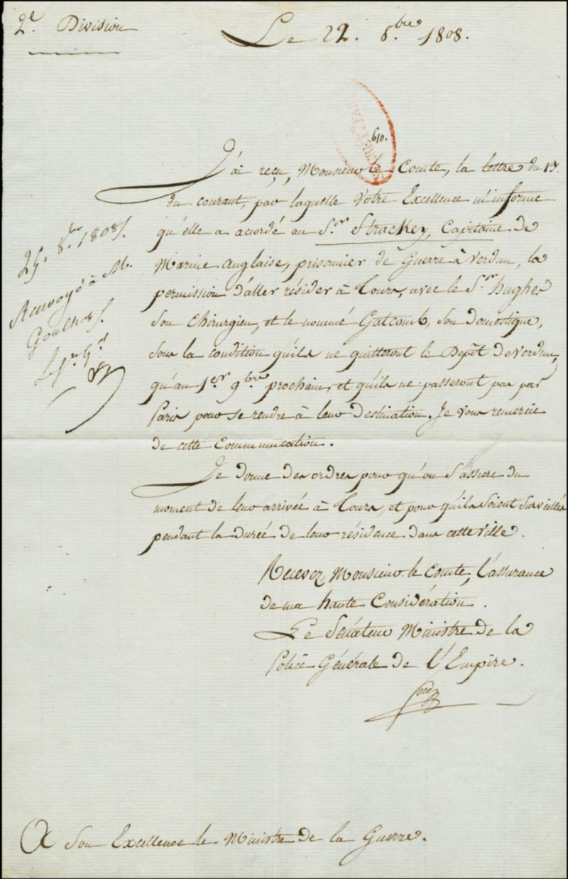 Joseph Fouché, Herzog von Otranto (1759-1820), französischer Politiker und Polizeiminister Napoleons, eigenhändige Unterschrift auf Schreiben 1808 an den Kriegsminister, bezüglich der Überwachung eines englischen Kriegsgefangenen. Attest v.d. Linden BPP