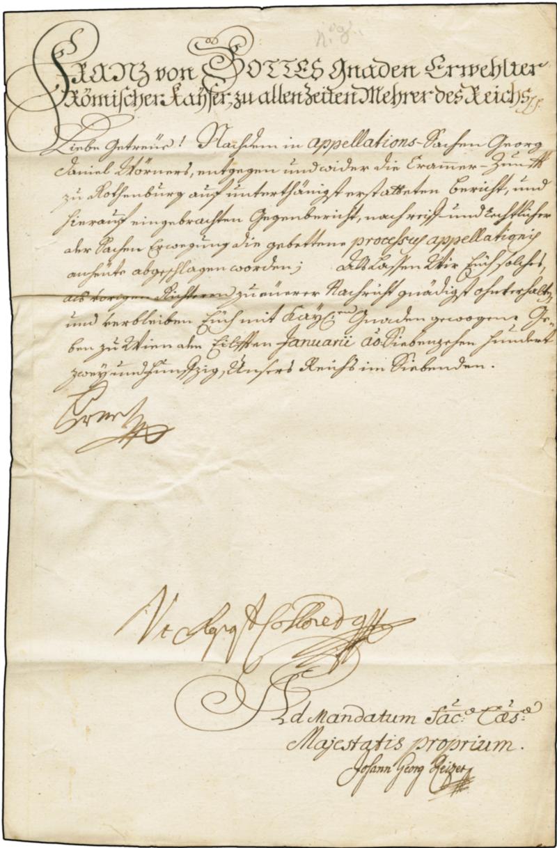 Franz I. (1708-65), römisch-deutscher Kaiser, eigenhändige Unterschrift auf Handschreiben 1752 an den Bürgermeister und Rat der Stadt Rothenburg an der Tauber. Schönes papiergedecktes Siegel und Gegenzeichnung durch Graf Colloredo.