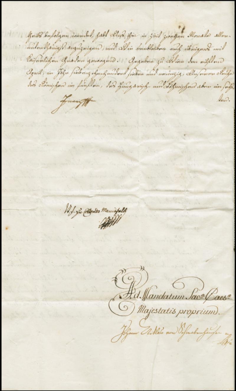 Franz II. (1768-1835), letzter römisch-deutscher Kaiser und Kaiser von Österreich, eigenhändige Unterschrift auf Handschreiben 1797 an den Bürgermeister und Rat der Stadt Rothenburg an der Tauber. Papiergedecktes Siegel und Gegenzeichnung durch Graf Colloredo.