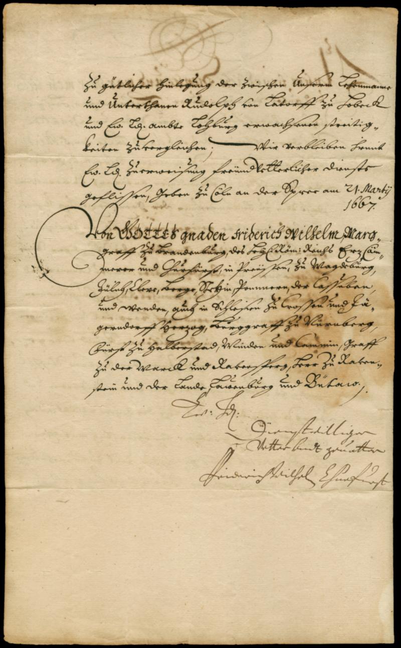 Friedrich Wilhelm,Kurfürst von Brandenburg (1620-1688), der "Große Kurfürst", kompletter Faltbrief mit eigenhändiger Unterschrift "Friedrich Wilhelm Churfürst" von "Cölln an der Spree 21 Martii 1667" an den Herzog August von Sachsen-Weißenfels. Papiergedeckte Siegel, etwas durchschlagend.