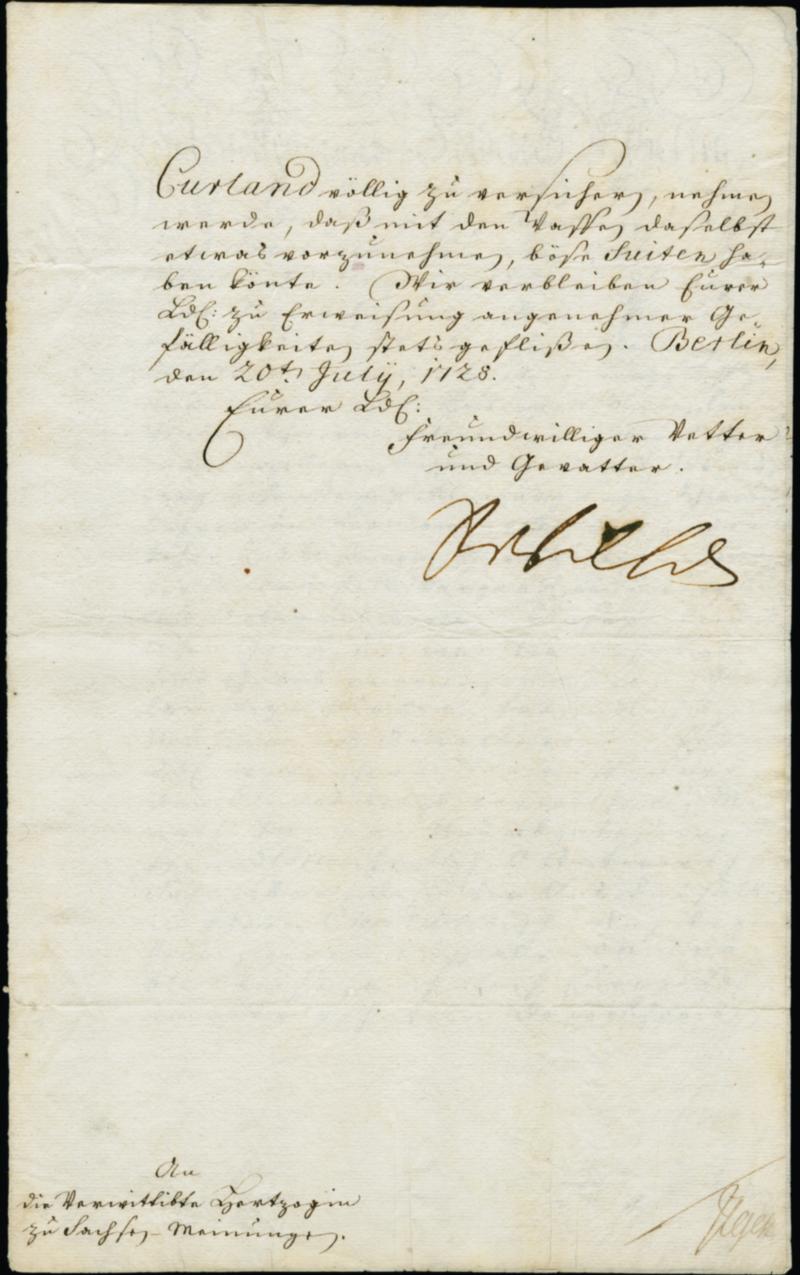 Friedrich Wilhelm I. von Preußen (der 'Soldatenkönig'), eigenhändige Unterschrift auf 3-seitigem Schreiben 1728 an die Herzogin zu Sachsen-Meiningen, betreffend Truppen im Herzogtum Kurland.