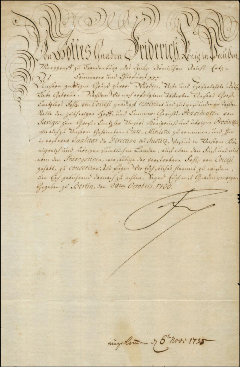 Friedrich II., König von Preußen (1712-86), Schreiben mit eigenhändiger Unterschrift, bezüglich der Ernennung des Kammer-Gerichtspräsidenten von Jariges zum Großkanzler, datiert Berlin 29. Oktober 1755. Leichte Randmängel und unten kleiner Teil beschnitten