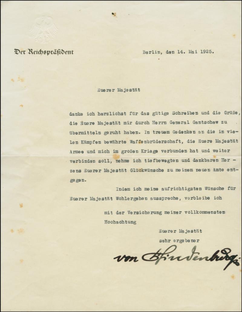 Hindenburg, Paul von (1847-1934), Generalfeldmarschall und von 1925 bis zu seinem Tode Reichspräsident, eigenhändige Unterschrift auf Schreiben "Der Reichspräsident" vom 14. Mai 1925, gerichtet an Kaiser Wilhelm II, mit Danksagung für die Glückwünsche zur Wahl zum Reichspräsidenten. Etwas fleckig. Ein geschichtlich interessantes Dokument.