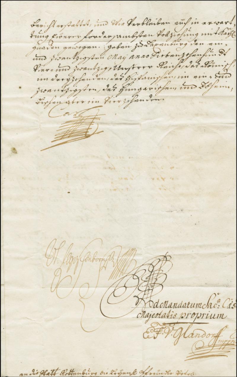 Karl VI. (1685-1740), römisch-deutscher Kaiser, eigenhändige Unterschrift mit goldener Tinte auf Handschreiben 1720 an den Bürgermeister und Rat der Stadt Rothenburg an der Tauber. Schönes papiergedecktes Siegel. Stärkere Faltung