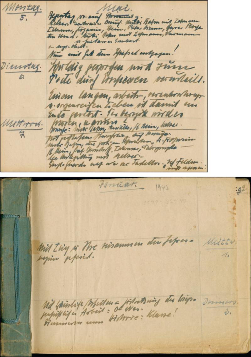 Kesselring, Albert (1885-1960), deutscher Generalfeldmarschall, Oberbefehlshaber der Wehrmacht in Italien, Träger des Ritterkreuzes mit Eichenlaub, Schwertern und Brillanten, eigenhändig geführtes Tagebuch vom 1.Januar 1947 bis zum 30. Juni 1949, auf A5-Blättern im Querformat, wahrscheinlich selbst gebunden (Vorder- und Rückdeckel fehlend). Meist stichwortartige Einträge, dabei Eintrag vom 6.Mai 1947 "Schuldig gesprochen und zum Tode durch erschießen verurteilt….". Ein einmaliges Dokument deutscher Geschichte.