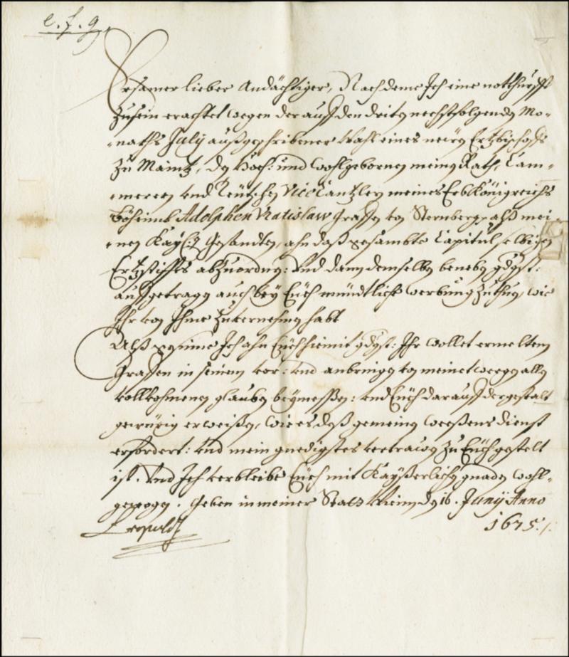 1659, Leopold I (1640-1705), römisch-deutscher Kaiser, eigenhändige Unterschrift auf kpl. Faltbrief 1675 an das Kapitel des Erzstiftes Mainz.. Schön erhaltenes kleines Lacksiegel. Adressseite getönt.