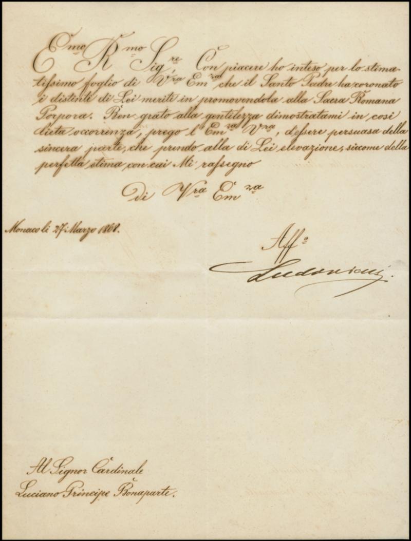 Ludwig II, König von Bayern (1845-1886), eigenhändige Unterschrift "Ludovicus" auf Schreiben 1868 in italienischer Sprache, mit zugehörigem Briefkuvert, an den Fürsten Luciano Bonaparte, mit Glückwünschen zu dessen Erhebung in den Kardinalsstand.