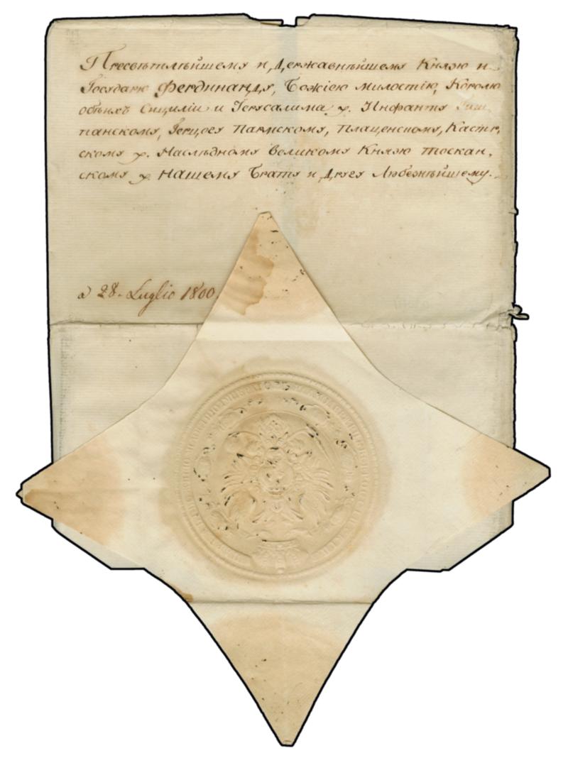 Paul I, Kaiser von Russland (1754-1801), großformatiges gefaltetes Dokument datiert "Tsarksoye Selo 28 Juli 1800”, eigenhändige Unterschrift "Paul”, mit komplettem Faltbrief mit Trauertext und Papiersiegel, Altersspuren und zwei innen mit nachträglich eingeklebten Fotografien, sonst in guter Erhaltung, selten
