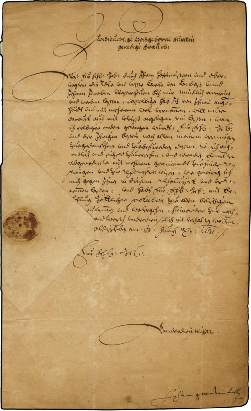 Johann Tserclaes, Graf von Tilly (1559-1632), bayerischer Feldherr, Oberbefehlshaber des kaiserlichen Heeres im 30-jährigen Krieg, Brief 1631 aus Oldisleben, mit eigenhändiger Unterschrift, an die Landgräfin Juliane von Hessen. Insgesamt etwas getönt. Ein seltenes Dokument aus der zeit des Dreißigjährigen Krieges.