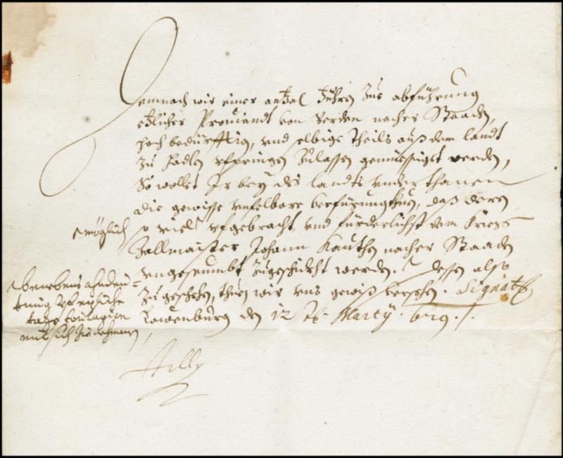Johann Tserclaes, Graf von Tilly (1559-1632), bayerischer Feldherr, Oberbefehlshaber des kaiserlichen Heeres im 30-jährigen Krieg, Brief 1619 mit eigenhändiger Unterschrift, von Lauenburg mit Eilvermerk "Cito/Cito/Citissime". Briefpapier im oberen Seitenrand etwas Wurm stichig. Ein seltener Beleg des 30-jährigen Krieges. Attest van der Linden BPP (2003)