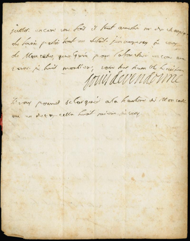 Vendôme, Philippe, Herzog von (1655-1727), französischer Marschall aus dem Haus Bourbon, kompletter Brief vom Juni 1697 mit eigenhändiger Unterschrift, während des pfälzischen Erbfolgekrieges, aus dem Feldlager bei La Roque an den Vize-Admiral Comte d'Estrees. Vendome ist im Begriff Barcelona zu erobern, hat aber nur noch für wenige Tage Proviant und bittet dringend um eine Lieferung. Barcelona fiel am 10. August 1697.