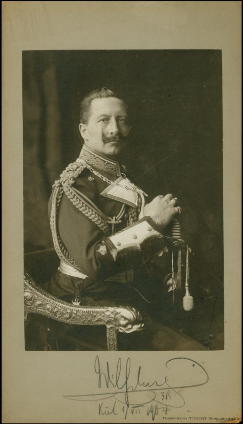 Wilhelm II, deutscher Kaiser, eigenhändige, datierte Unterschrift "Wilhelm IR Kiel 1/VII 1904" auf Portraitfotografie (ca. 320:185 mm) des Hoffotografen Voigt. Trägerkarton kleiner Eckmangel.